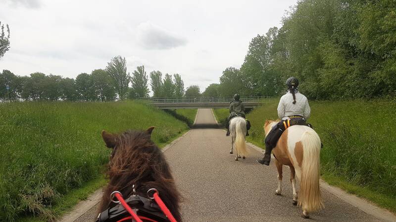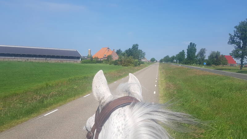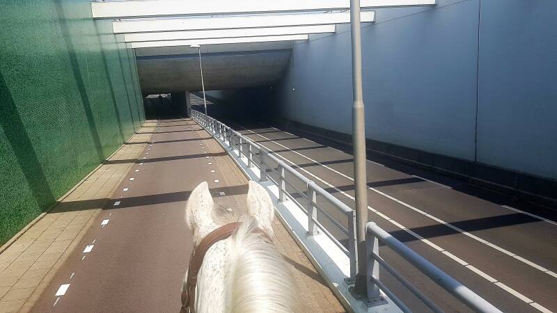 Daarna volgen we kilometers de ventweg langs de grote weg, waar het gevaar ineens om de hoek komt op de plek waar je hem niet verwacht. Alles heb je van te voren overdacht ( en de laatste dagen voor vertrek nog bijna van wakker gelegen): drukke verkeersaders, bruggen, ouders die hun kinderwagens onder de voeten van het paard duwen, kinderen op slippertjes die je paard willen aaien enz enz.