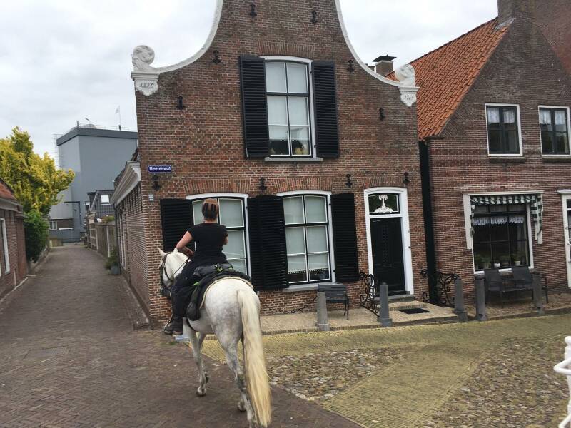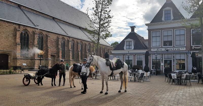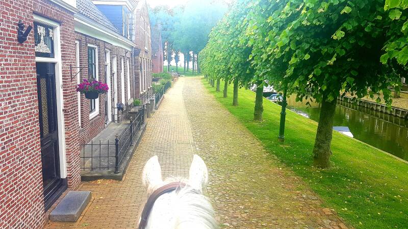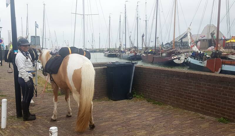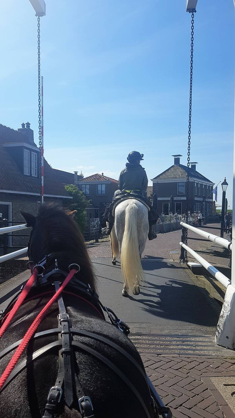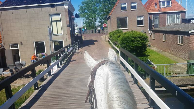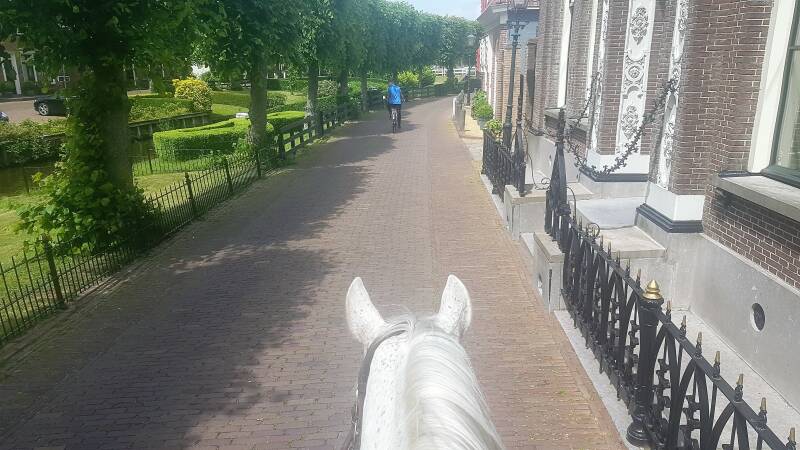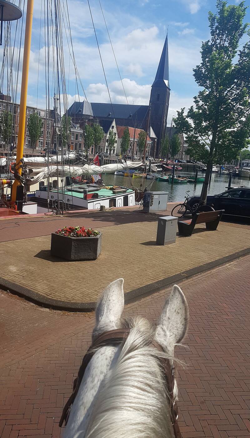 Het oorspronkelijke plan was niet dwars door Workum te rijden maar de buitenkant aan te houden. Dit nadat het hotel in het centrum die ik een paar weken geleden had gemaild of we daar mochten stempelen, me speciaal gebeld had om te zeggen dat die dag de wandel Elfstedentocht langs kwam en het een gekkenhuis was bij hun voor de deur. En eigenlijk onmogelijk daar dan met een paard doorheen te rijden. Op dat moment had ik dat advies ter harte genomen, de route omgelegd en een ander stempelpunt buiten het centrum gezocht. Maar ja, we waren toen we vanmorgen vertrokken natuurlijk al wel 147, 5 km op Friese grond verder en de paarden krijgen iedere dag minder behoefte om ook maar ergens van te schrikken. Dus slaan we de goedbedoelde adviezen alsnog in de wind en rijden gewoon dwars door Workum. En dat is een goede keuze want vergeleken met zaterdagmorgen in Sneek lijkt deze woensdagmiddag in Workum wel zondagmorgen in Lutje broek.