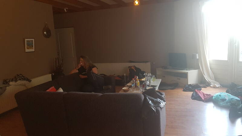 We zijn dan ook blij als de bestemming bereikt is, rond zes uur rijden we als verzopen katten het terrein van Bed en Breakfest Claercamp op. Daar worden we hartelijk welkom geheten door Matsje en haar man Sjoerd. De paarden mogen bij de buren in een stal en wij genieten van ons prachtige en gezellige appartementje. En ik dank God op mijn blote knieën dat we vannacht niet in een tentje slapen.