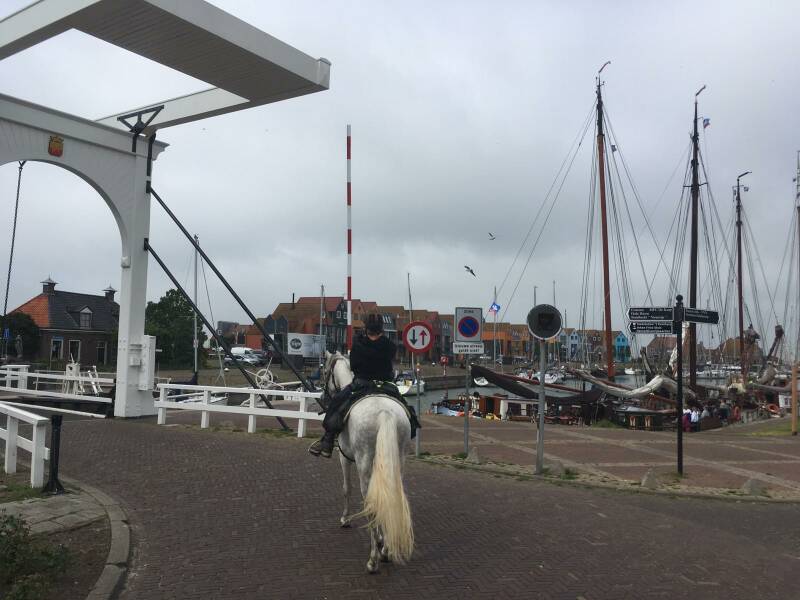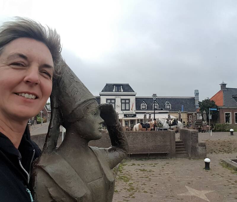 Na een goede nachtrust is het weer de routine van inpakken, bepakken en vertrekken. Wel met enige vertraging omdat er eerst bij twee dames weer uitgebreid haren gekamd en gevlochten moesten worden, en ik onderdruk een zucht terwijl ik het vrolijke gekwebbel aanhoor. Maar het zal misschien de kift wel zijn omdat er bij mij natuurlijk weinig te kammen en vlechten valt. We nemen hartelijk afscheid van de ook al weer zo gastvrije eigenaren van de manege en gaan op weg voor de eerste vijf kilometer naar het plaatsje Stavoren. Het hooghartige vrouwtje van Stavoren is eigenlijk best een klein beeldje en zo neergezet dat je er onmogelijk met een paard bij kan kan komen. Maar als het beeldje niet naar ons komt moeten wij dus maar naar het beeldje.