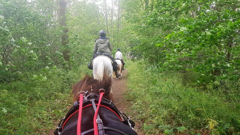 De bossen zijn prachtig en het landschap ineens verrassend glooiend. Het enige wat we niet ingecalculeerd hadden was dat de bospaden eerst super maar al snel helaas echt verschrikkelijk mul waren. En daarmee voor Bean met zijn sulky met alle spullen en dan ook nog mijn dikke kont net een beetje te gek zwaar. Zal je ook net zien dat het precies mijn beurt was om Bean te rijden en Anouk op Alegro... Dus ging moeder lopen naast de poony voor een uurtje of anderhalf. Nou ja, spierpijn had ik toch al. Maar het drukt de snelheid natuurlijk wel en uiteindelijk bereiken we pas tegen half vijf onze bestemming.