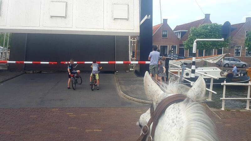 Als de dikke wafel met slagroom achter de kiezen is rijden we 40 meter verder op een obstakel die we deze week nog niet hebben gehad: de met rinkelende bellen opengaande brug waar je bijna 5 minuten voor moet wachten voor de brug eindelijk weer dicht gaat. Voor Alegro is dat nog wel een beetje een opgave, als Andalusiër is lang stilstaan niet zijn grootste goed.
