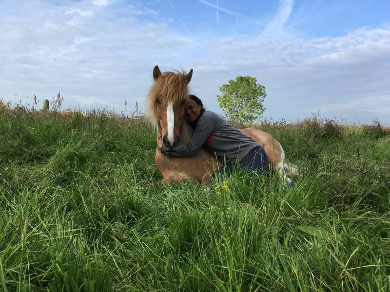 Maar een door het gras onzichtbaar gat in de bodem calculeer je niet in. Gjörningur zakt met 1 voorvoet ineens 30 cm lager, zakt door zijn voorbenen en Cathelijn vliegt er over de kop af. Als door een wonder komen ze beide met de schrik vrij. Gelukkig is Cathelijn nogal nuchter aangelegd dus na de constatering dat Gjört niet kreupel is stapt ze op en vervolgt ze ontspannen de verdere tocht.
