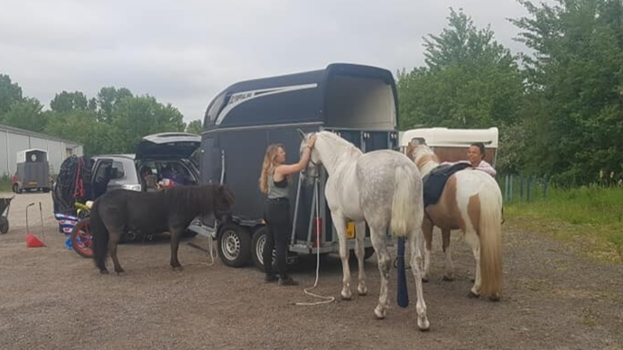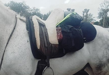 Wel oefenen we uitgebreid met de verpakking en ik ben blij met de Sulky van Bean, waar je ineens verassend veel zooi aan blijkt te kunnen hangen ( verpakt in waterdichte kanotassen). Voor Alegro schakel ik toch weer terug naar mijn gewone Engelse zadel. Het is immers 4 kilo lichter dan het trektochtzadel ( en op deze afstanden gaan de kilo's echt tellen). Ja en inderdaad, ik weet dat ik in 2017 riep dat het Engelse zadel niet geschikt is om veel bagage aan te hangen. Maar inmiddels heb ik via de FB groep "trektocht te paard" van iemand een goede tip gehad om met een Engels zadel toch de rug vrij te kunnen houden van drukkend gewicht. Je hangt een bokriempje aan de voorkant en daarover trek je een spanband via een haakje aan de achterkant van het zadel en trekt dat strak aan, en voilà. Twee en halve week voor vertrek zorgt de smid nog voor ijzers met widiapunten erop, zodat deze minder zullen glijden en slijten op het lange asfalttraject.