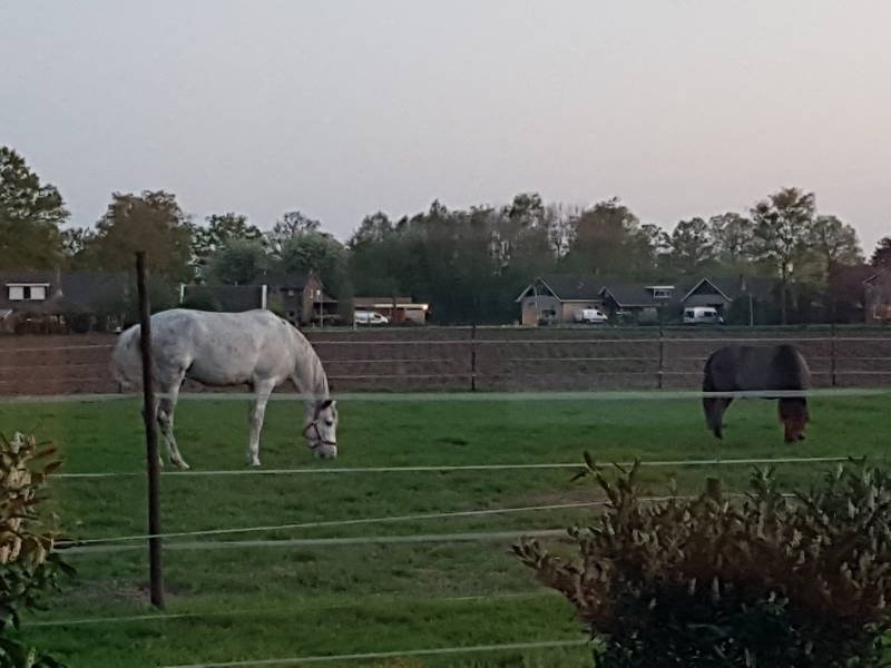 Hippisch centrum de Achterhoek klinkt wat misschien wat chique, maar hoewel keurig verzorgd en netjes is het helemaal geen kakkerige bedoening. Onze slaapplaats is de oude kantine boven een binnenbak waar een appartementje van gemaakt is, en dat maakt het heel apart. De paarden mogen eerst nog fijn even de wei in voor ze op stal gaan.
