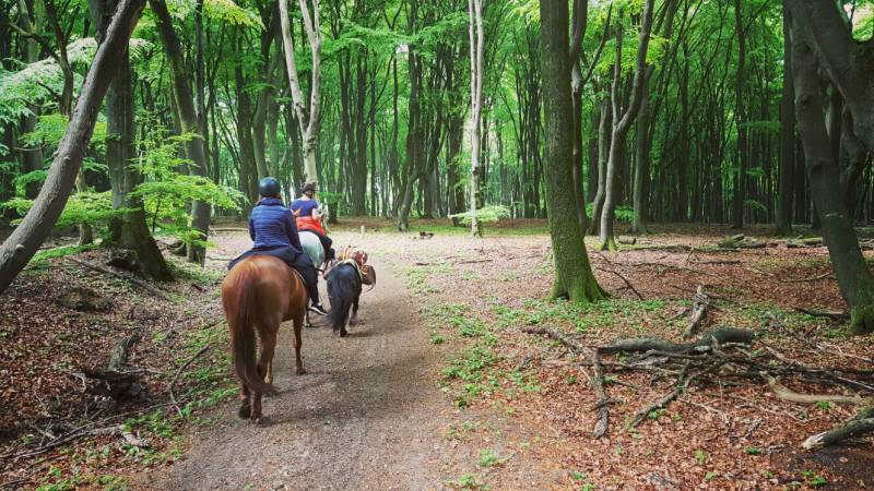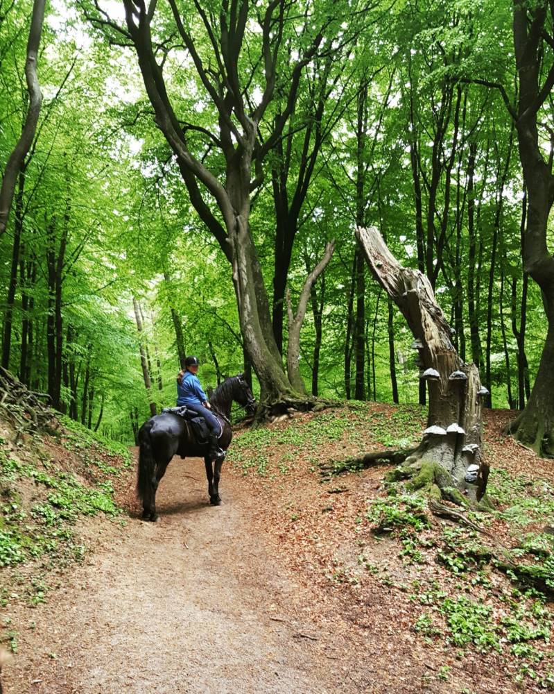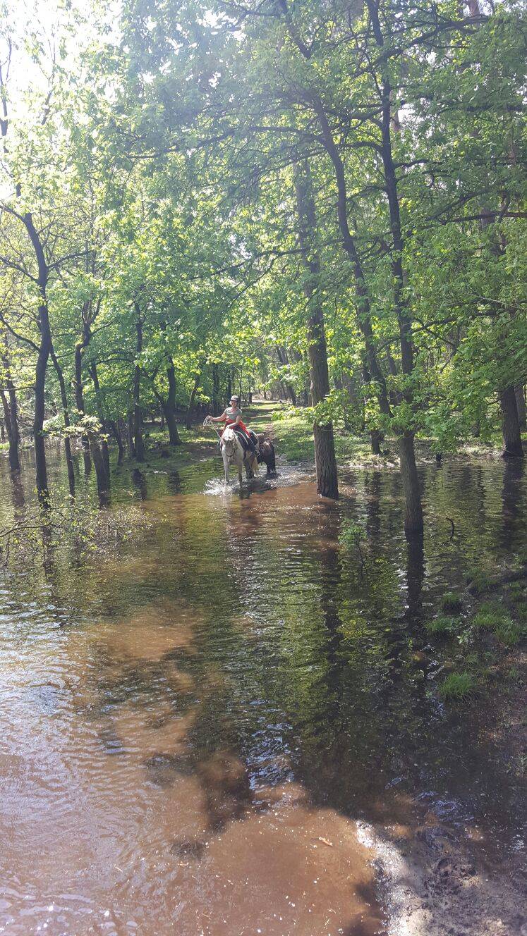 Om de lange route wat af te snijden en om het avontuur er een beetje in te houden, besluiten we een stuk van de ruiterroute af te wijken. Dat levert een werkelijk prachtig stukje bos op met een pad waar een beek dwars door heen loopt, en waar we eerst door moeten om weer verder te kunnen. Dat lukt zonder problemen.