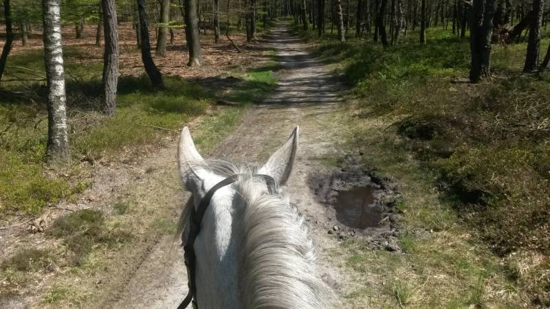 Vandaag is niet de allermooiste rit qua natuurschoon, maar wel lekker spannend. Door de kroondomeinen van Emst terug naar het zuiden loopt eigenlijk maar 1 ruiterpad en dat voert door redelijk druk gebied inclusief spoorovergang en viaduct. Bovendien was ik dat ene ruiterpad ongeveer halverwege al kwijt, en toen werd het maar hopen dat we de boswachter niet tegen kwamen. Ook op de eigenaren van loslopende, blaffende en aan de achterbenen van de paarden snuffelde honden kun je natuurlijk niet schelden als er op de ingang van het Apeldoornse stadspark waar we dwars door heen trokken, met grote letters VERBODEN VOOR PAARDEN staat. Maar met een beetje omrijden en hier en daar het nemen van een Veerkamppad, reden we uiteindelijk tegen vieren met ongeveer dertig kilometer op de teller het terrein van het hotel op.